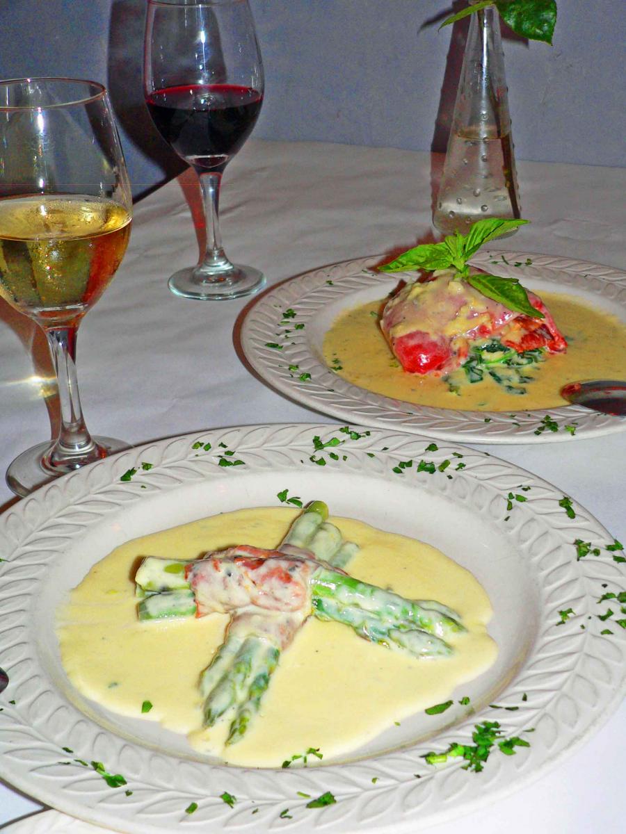 David started us off with two appetizers: Asparagi con Prosciutto, Asparagus spears wrapped in cured Italian Ham (prosciutto) in a gorgonzola Cheese cream sauce, and Pepperone Rosso Ripieno, red bell peppers filled with fresh mozzarella and prosciutto over a bed of sautéed spinach in a garlic cream sauce. Magnifico!