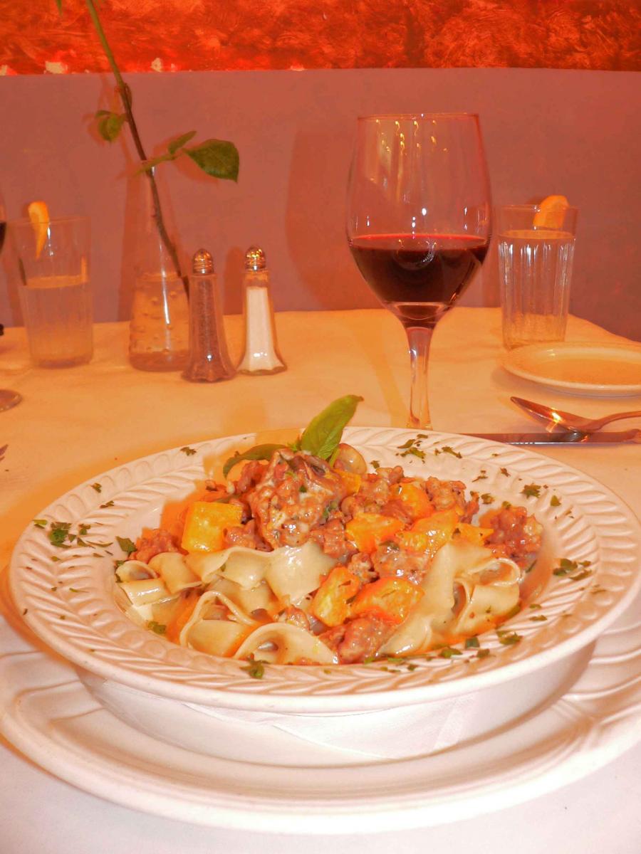My favorite, and the most unique dish sampled, was Papperdelle con Zucca e Salsiccia: home-made wide fettucine with mild Italian sausage and butternut squash in a delicate white wine cream sauce. A family friend of the owner brought this dish from Sicily and now it is a popular ‘Special of the Day.”