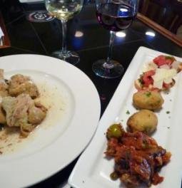 Another is Carciofi alla Guidea: artichokes sautéed with extra virgin olive oil, garlic, parsley and basil. My friend and I had that, along the Italian Tio – rice soufflé, Bruschetta al Pomodoro Sicilian and eggplant caponata (with olives and onions served cold). These were delectable appetizers, seasoned to perfection.