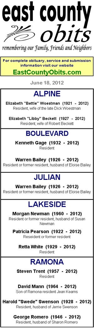 EAST COUNTY OBITUARIES, JUNE 19, 2012