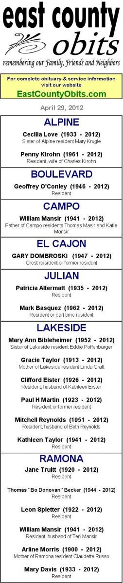 EAST COUNTY OBITUARIES, May 3, 2012