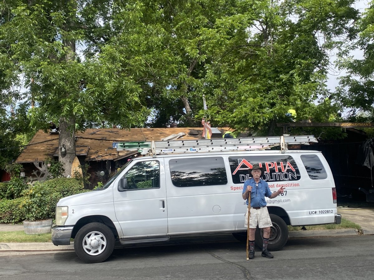 (Left: Tom Weller in front of his El Cajon home while a group of workers organized by the East County Posse fix the roof, photo courtesy East County Posse)