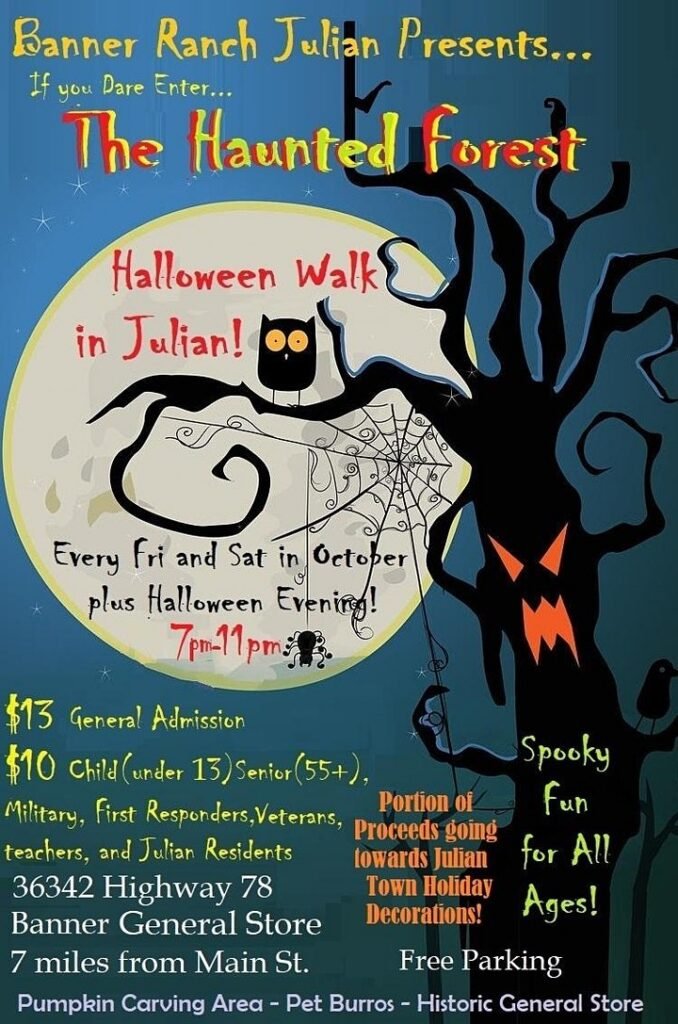 October 27, 2021 (Julian) – You’re invited to get into the Halloween spooky spirit Halloween weekend at Ghost Town Banner City’s haunted forest from 7 to 11 p.m. The Haunted Forest is located at historic Banner Ranch about seven miles from downtown Julian.