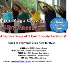 Printer-friendly version By Liz Alper February 18, 2016 (San Diego’s East County) – Healthways Silver Sneakers Yoga in East County is offering five free-of-charge yoga classes to anyone interested in participating. The classes are supported by the Friends of the Libraries organizations of the El Cajon, Casa de Oro, Lemon Grove and La Mesa Libraries. Four of