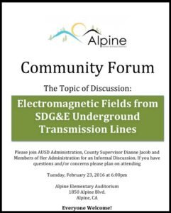 Printer-friendly version East County News Service February 20, 2016 (Alpine) – A community forum to discuss electromagnetic fields from SDG&E’s underground transmission lines will be held on Tuesday, February 23 at 6 p.m. in the Alpine Elementary auditorium (1850 Alpine Blvd.) You’re invited to join the Alpine Union School District, Supervisor Dianne Jacob and members of her