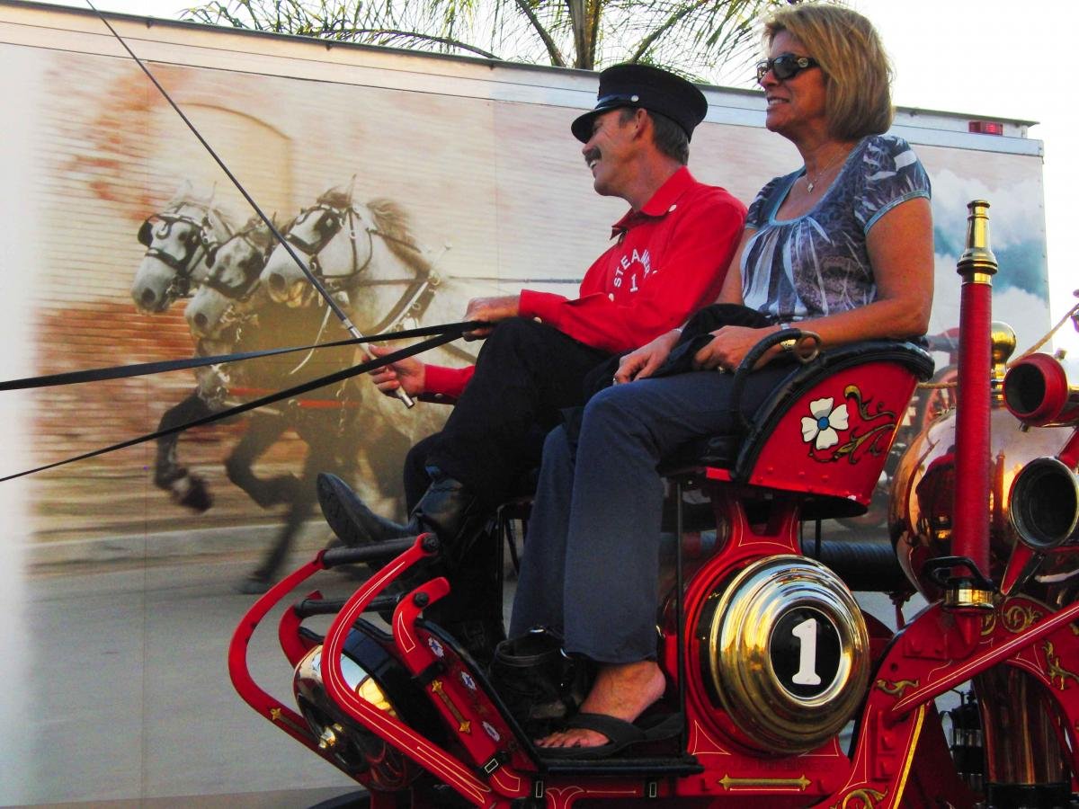 The community celebration known as Cruisin’ Grand features pre-1973 era American-made cars, which take over downtown Escondido every Friday night from April through September. This year, theme-based nights were added. The most recent cruise, in honor of September 11, featured classic fire trucks. The largest and most popular display was by the California State Firefighters Association (CSFA) showcasing a 1902 pump-only horse-drawn fire engine.