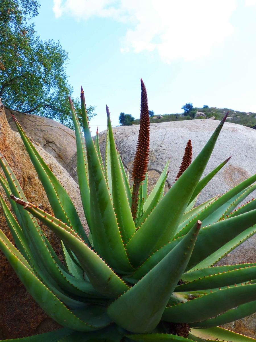 Fire-resistant succulents and native plants as landscape need only rain water to thrive, though drip irrigation has been used to establish young plants.