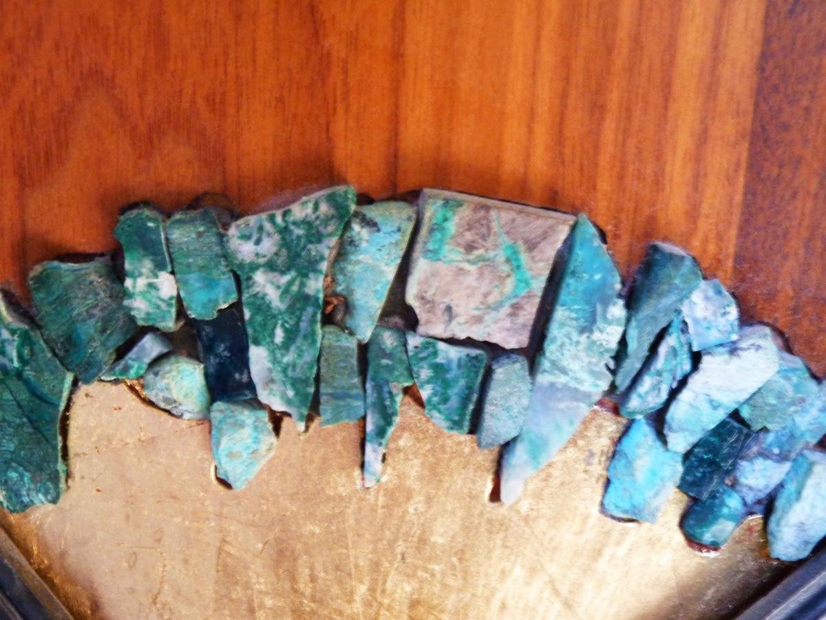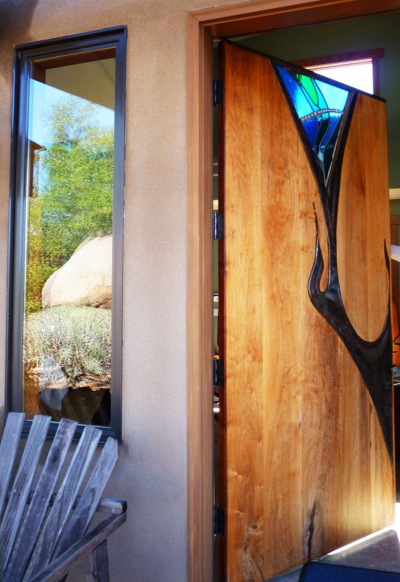 “I said it would be really nice to have a fire element,” Scott Anders said, opening a broad wooden door with a dramatic free-form fire mosaic element. “The flames yield to a brighter pastel flower rising out of the ashes.” On the interior side, the door includes additional gemstone detailing.