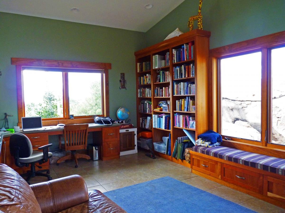 Rich woods and other natural materials infuse the home with warmth, as in the sunny home office at the front of the residence.