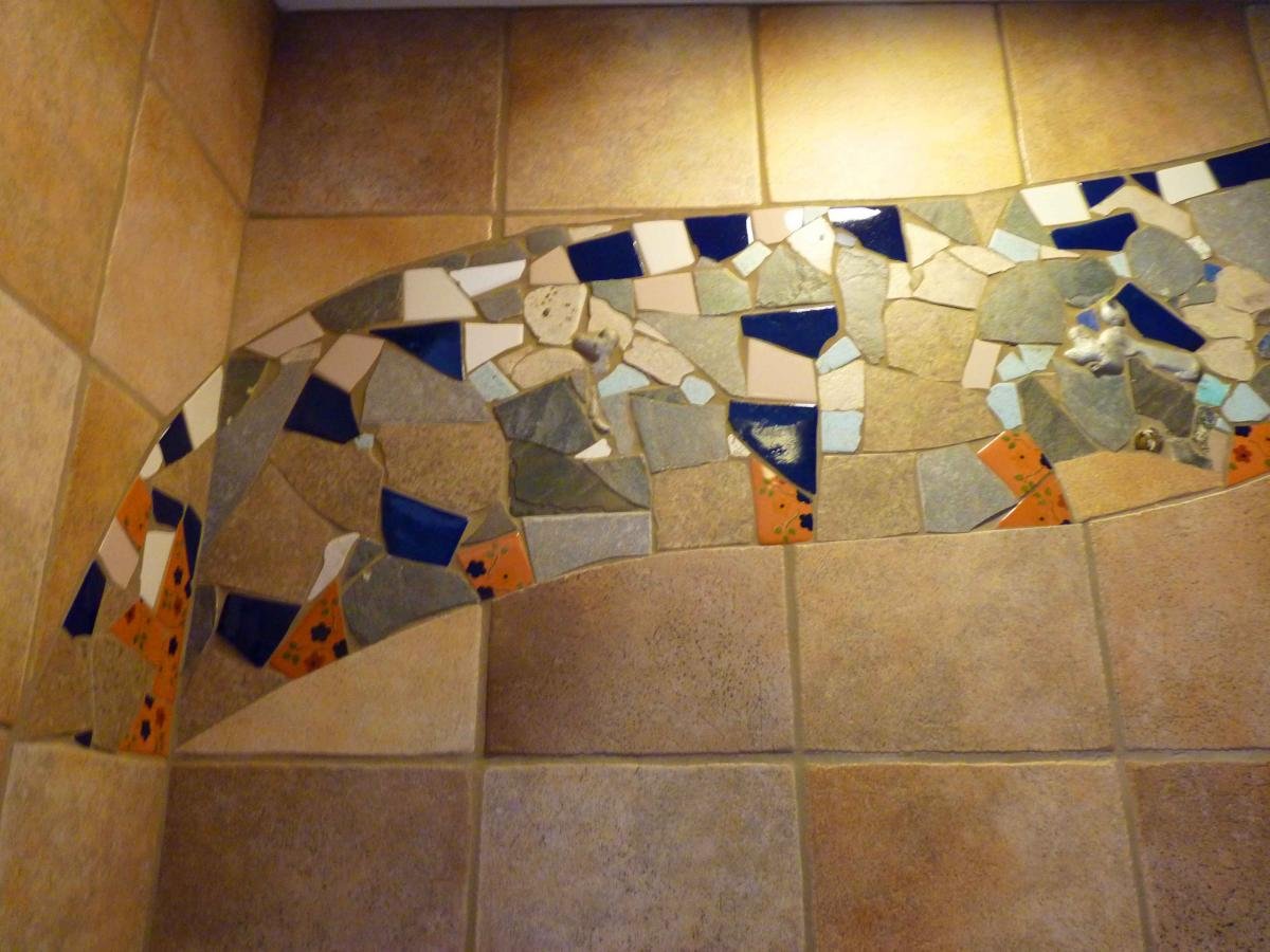 Hubbell also created wave-like mosaic in a stone-lined shower.