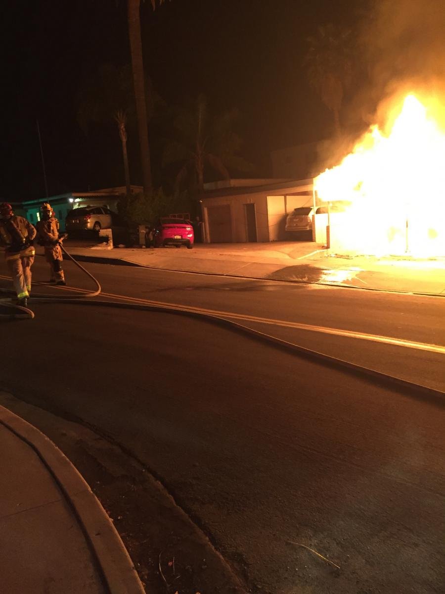 March 16, 2015 (La Mesa)–Heartland Fire & Rescue crews from La Mesa, with assistance from San Diego Fire, were dispatched to reports of a car fire in the 7900 block of La Mesa Blvd Saturday night.  The call was quickly upgraded to a residential structure fire after dispatch received multiple cars of a fire.