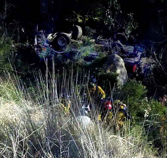 January 7, 2010 (Crest)– A difficult but successful rescue was made Thursday afternoon by members of the San Miguel Fire District. Crews were called to La Cresta Road near Coyote Ridge moments after a vehicle veered off the road and plummeted down a 300 foot embankment. A large SUV with two occupants rolled several times down the steep embankment and landed on its roof.