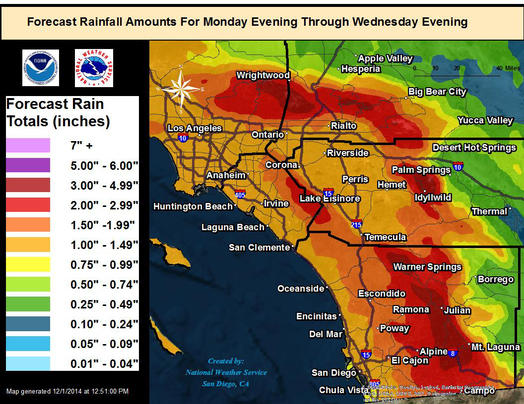 December 1, 2014 (San Diego) – The National Weather Service has issued a flash flood watch for Tuesday and early Wednesday in San Diego County’s mountain, valley and coastal areas.
