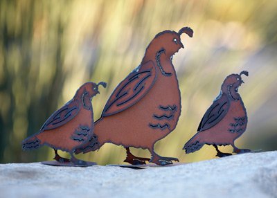 an yard art creations at Anza-Borrego Desert Nature Center, Borrego Springs: Shopping at this delightful store run by the Anza Borrego Natural History Association or on their website supports desert education programs. These Gambel’s Quail steel artisan-handcrafted yard art items range from $23.95 to $44.95. Buy a flock to parade across your patio or display on your dining room table! The shop also carries a variety of art, artisan crafts, photography, jewelry and more, all with a desert or southwest theme. Visit at 652 Palm Canyon Drive, Borrego Springs or online at https://www.abdnha.org/store/