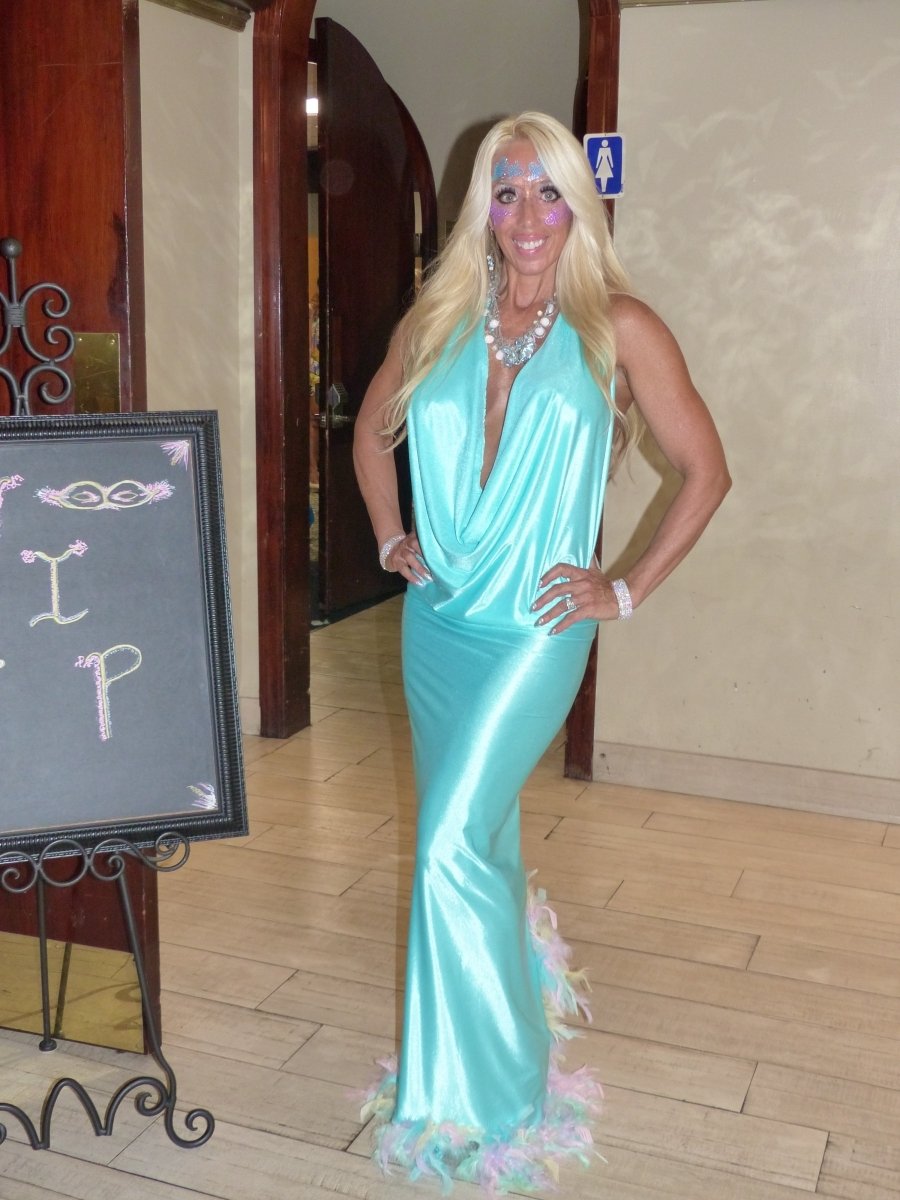 Delaney’s creative dress designs from her company, La Del Designs, were among those on display by runway fashion models. Other local designers included were Marjoire Pezzoli from Pezzoli Art, Debbie Solan from Idea Field (right, in on of her elegant creations), and Dawn Debaugh.