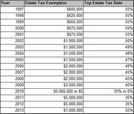 Below is a chart showing the Estate Tax Rates from 1997 – 2013: