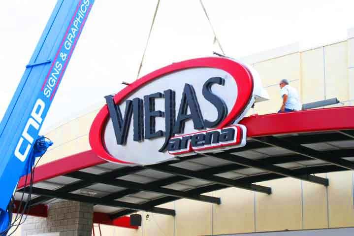 The major Viejas Arena signs, including over the main entrance and the sign along Highway 8, went up this week. Crews are working on hundreds of other sign locations, as the Viejas Arena name is unveiled across the campus.