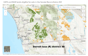 Printer-friendly version By Miriam Raftery Image: Lands proposed for sale in Rep. Darrell Issa’s district June 18, 2025 (San Diego’s East County) – Senate Republicans have slipped language into the “One Big Beautiful Bill Act” budget reconciliation measure that would allow sale of up to 250 million acres of federal public lands in 11 states including California. The Wilderness Society