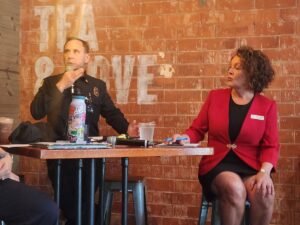 Printer-friendly versionStory and Photos By Karen Pearlman April 11, 2025 (La Mesa) — “No matter how it’s sugarcoated, battery storage facilities are dystopian looking, loud, detrimental to real estate values and potentially deadly,” La Mesa City Councilmember Laura Lothian says. For several years, Lothian (pictured above, with Heartland Fire & Rescue Fire Chief Bent Koch) has been a