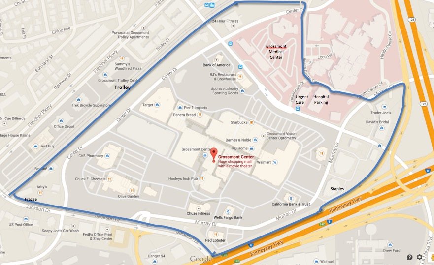 Their combined commercial properties run all the way from the trolley tracks to Highway 8, and Health Center Circle to their side of Jackson Drive. It includes not only Grossmont Center but all the commercial properties surrounding it. The list is long: Grossmont Medical Center, the Urgent Care Center, the parking building for the hospital, Trader Joe’s, the Staples-Guitar Center, Red Lobster, Friar Tux, Arbee’s, Frazees, BevMo, Bank of the West, and 24 Hour Fitness. (See map at bottom.)