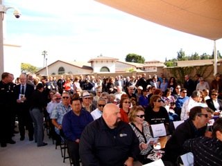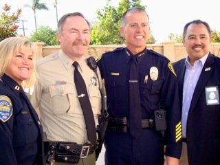 April 7, 2015 (La Mesa) — It was a perfect spring day in La Mesa for the outdoor swearing in of the new Police Chief, Walt Vasquez (photo, left), joined by his family (photo, below right). The charisma and popularity he brings with him was clear to see in the size and responsiveness of the crowd.