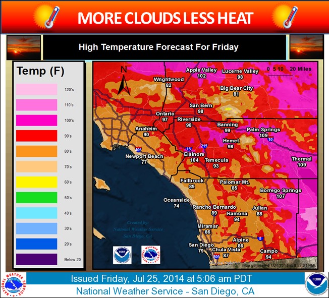 July 25, 2014 (San Diego’s East County)- A hazardous weather warning remains in effect through tonight across our region, with high temperatures expected to continue through this weekend, cooling slightly.