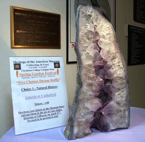 April 12, 2013 (Rancho San Diego)—“The Museum’s Five-Choices Dream Raffle is always a hit at the Spring Garden Festival. Because it’s our 20th anniversary, we really went all out this year,” says curator Kathleen Oatsvall at Heritage of the Americas Museum on the campus of Cuyamaca College. So the Museum chose five fabulous prizes—one to honor each wing of its museum (natural history, archaeology, anthropology and art) plus the museum gift shop.
