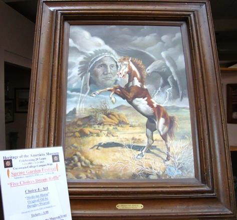 The Art Wing choice is a beautiful original oil by Douglas Weaver titled “Medicine Horse.” It was donated by Jeff and Sally Rogers. It is appraised at $800.00. You may have seen another Douglas Weaver painting in Case 65 of the Art Wing titled “His Favorite Wife.” This painting is Choice Four.
