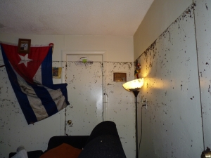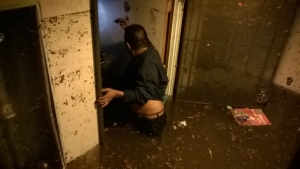 An older woman stood outside her downstairs apartment, a lost look in her eyes. The tiny space where she lives now holds a jumble of furniture upended –a ruined couch, toppled chairs—as well as a floor lamp with mud caked on top and a dark water mark that stops about a foot and a half below the ceiling.