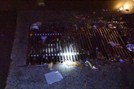 Duarte said, “I jumped into the water that was up to my chest.” Water was coming out fast from a storm drain between the apartment complex and a house abutting the property that was recently remodeled. There was a lot of dirt and some bricks on the storm drain (photo, left), according to Duarte. He removed the bricks and debris, which started to clear the brackish water.