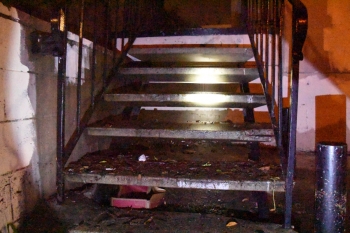 Someone knocked a hole in a brick retaining wall to start water draining out of the flooded courtyard where Duarte fought to save lives. Water climbed above the first story landing of the staircase (photo, right). Duarte cleared dirt and debris away from both drains—and just in time.
