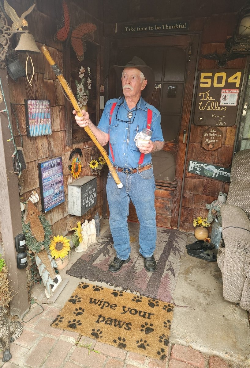 While health issues forced him off the road in 2017, Weller (photo left, Weller in front of his El Cajon home) still goes by the name “San Diego Highwayman” for his decades of service changing tires, replacing batteries, filling up empty gas tanks, standing watch over drivers and passengers in need – all at no charge.