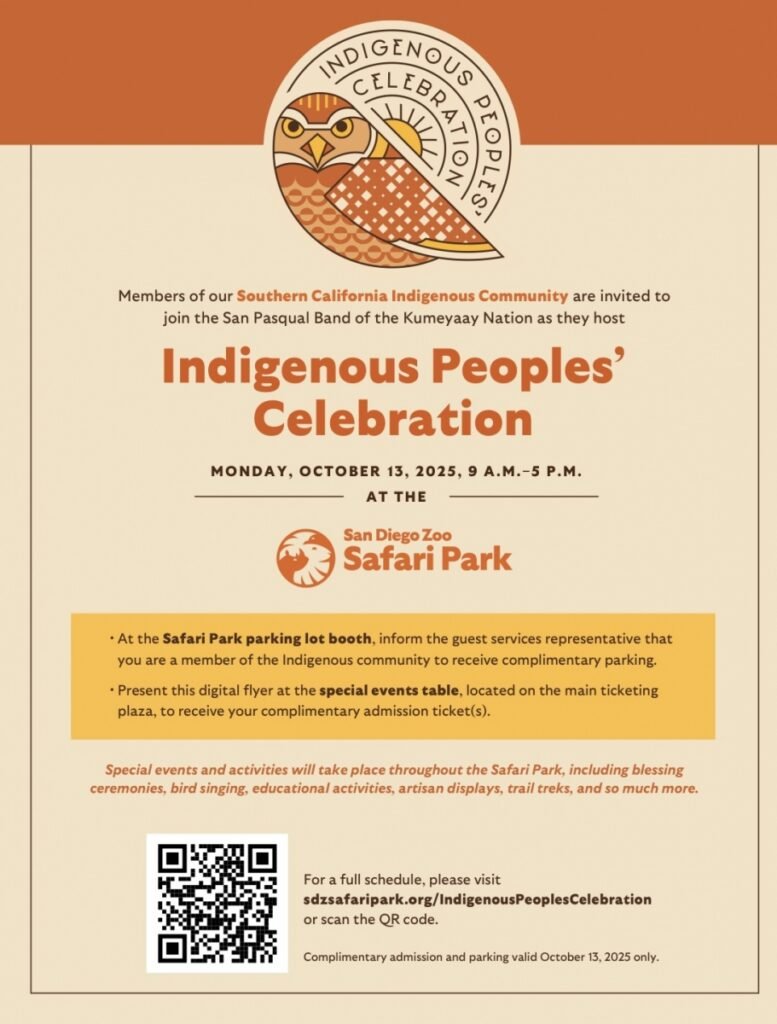 October 10, 2025 (San Diego) – The annual Indigenous Peoples’ Celebration, organized by the San Pasqual Band of the Kumeyaay Nation and San Diego Zoo Wildlife Alliance, will take place at the San Diego Zoo Safari Park on October 13, 2025 from 10 a.m. to 5 p.m. The event celebrates Indigenous communities, their cultures, and their commitments to wildlife. The event is open to the public, and all are welcome. Members of Indigenous communities will receive free admission to the Safari Park all day. More details about the event schedule are below and at sdzsafaripark.org/indigenouspeoplescelebration.