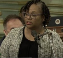 Photo, left: Lori Wilson, screenshot from Assembly video during AB 1421 discussion