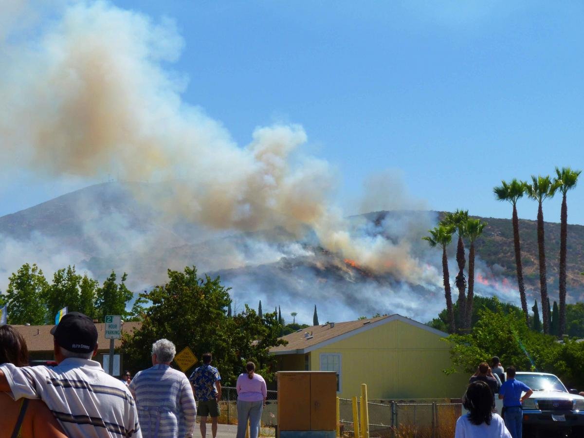 Anxious residents poured into the streets to watch the fire at the Lamplighter Village mobile home park, where flames encroached just behind the complex. Smoke is visible from throughout East County and an evacuation center has been set up at Skyline Church.