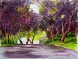 Printer-friendly version “The Jacaranda Street painting is a street in Spring Valley that is so beautiful in the early summer that my husband came home from work and took me to see it. I took several photographs of the street in its full purple glory, and painted from the photos,” said Sharon Thomas, who painted the picturesque scene in watercolors.