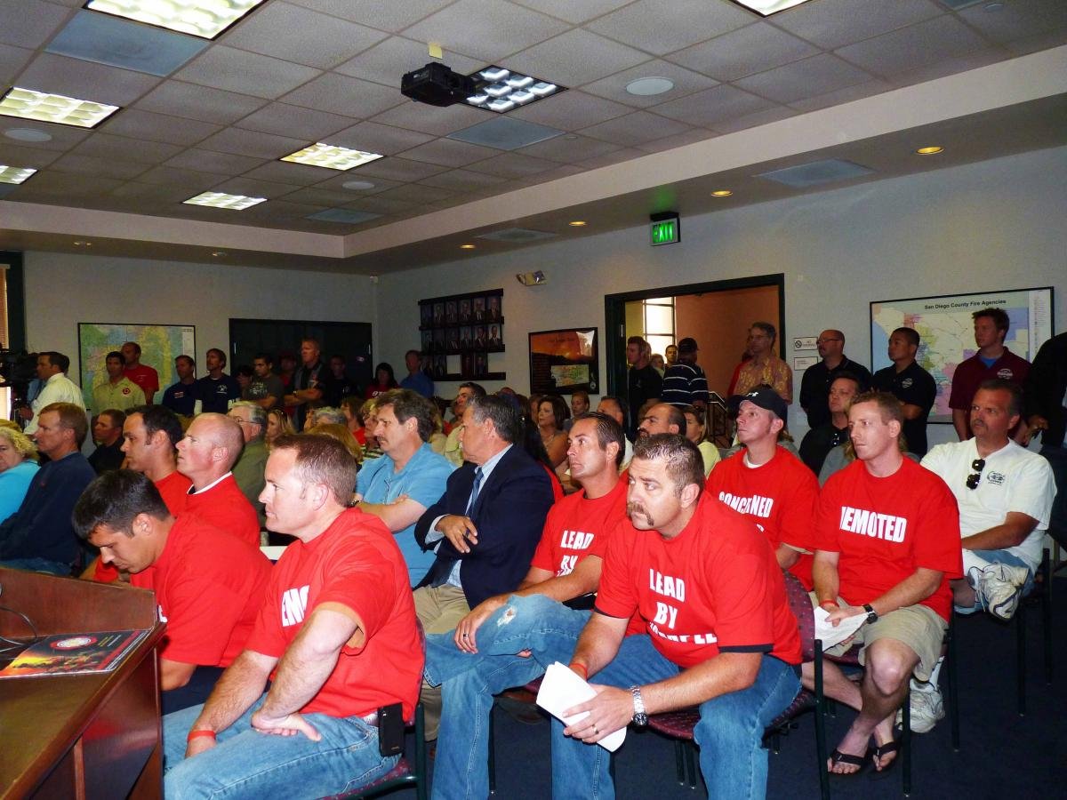 May 27, 2010 (Spring Valley) – Facing a $1.6 million deficit, San Miguel Consolidated Fire Protection District’s Board tonight considered a proposal to lay off three firefighters, eliminate the Administrative Division Chief position and demote several officials.  But after hearing moving testimony from firefighters, fire and accident victims, and others in the community, the Board voted unanimously to reject the recommendation and consider other options.