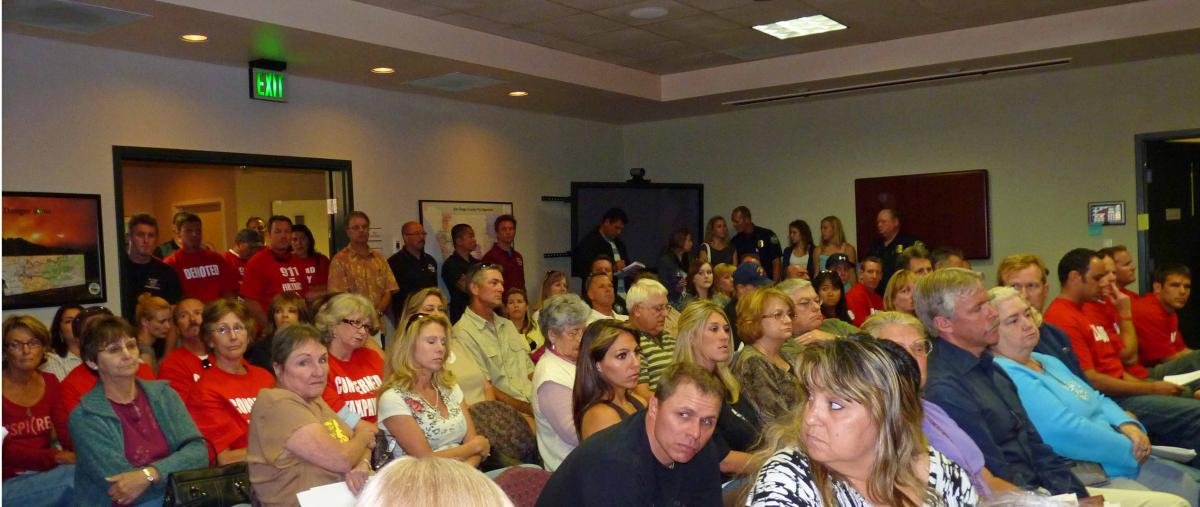 Lori Bruner lost her Crest home in the 2003 wildfires. “A friend lost her daughter, her hands and her feet,” she said. “I was in the backyard when that 200 foot fire tornado hit and we didn’t have anyone there.” Since then, the District has cut seven firefighters and one engine. “Now you want to cut more firefighters?” she said, adding that she is outraged. “You are empowering who lives and who dies with how you vote.” Another Crest resident testified that she was afraid of losing fire insurance if firefighting protection is cut back.