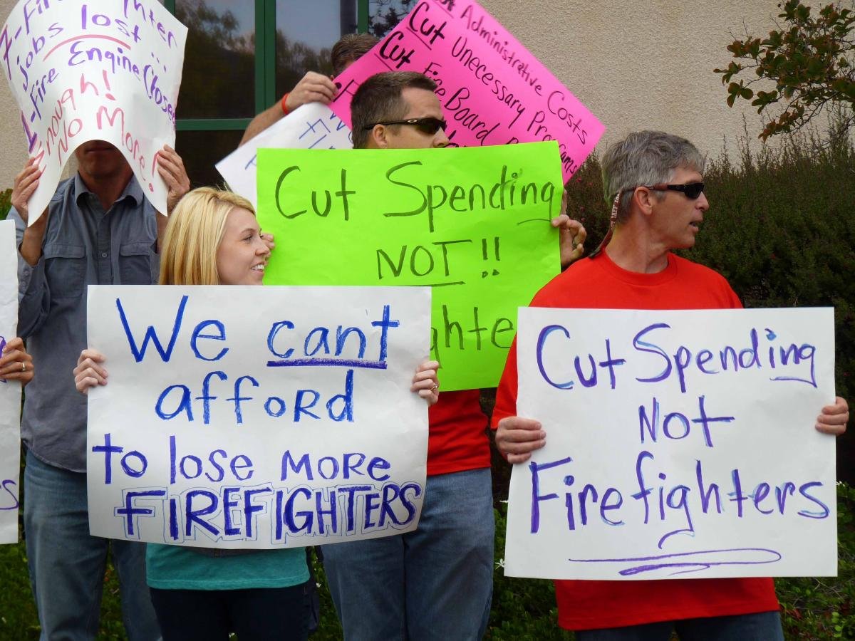 The plan to lay off firefighters sparked an outcry of public protest. Before the meeting, firefighters and supporters picketed outside meeting chanting “Cut the fat.”