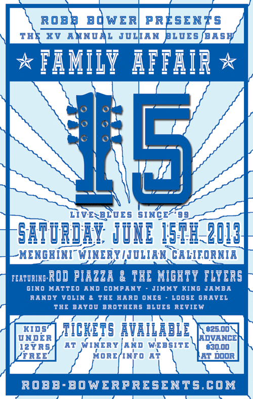 June 12, 2013 (Julian) – Musicians will be wailing the blues on Saturday, June 15, when Robb Bower presents the 15th annual Julian Blues Bash “Family Affair.” Six blues bands will perform all day. The event also features dancing, food, beer, wine tasting and free parking.