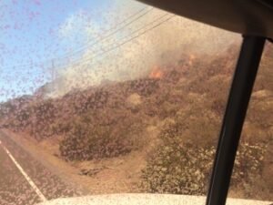 Printer-friendly version By Miriam Raftery Photo: Sparks across roadway driving through the Border Fire, by Richard Edwords New fires are burning in Mexico near the border June 20,2016 (San Diego’s East County) – The Border Fire has swelled to 7,500 acres and is still only 5% contained, Cal Fire announced this evening, adding, “Triple digit temperatures and single digit humidity