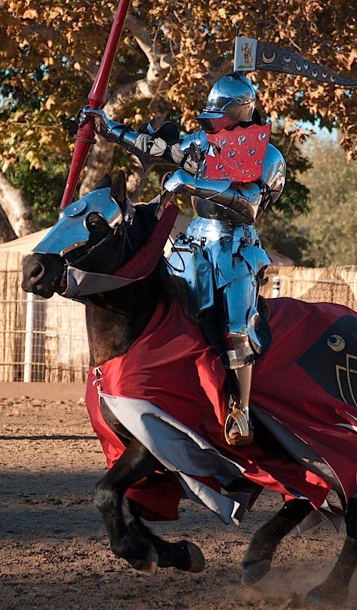 Asked what prompted him to engage in live jousting, he explained, ““I didn’t like what I saw at Renaissance Fairs. So went to England.” There he saw jousting at the Royal Armory Museum at Leeds. “Four months later I was competing there.”