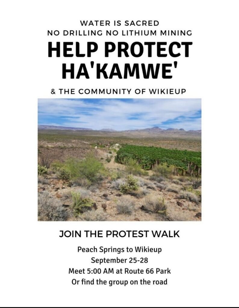 The “Help Protect Ha’Kamwe and the community of Wikieup’” walk is slated to begin in Peach Springs, Arizona starting at 5 a.m. at the Route 66 Park and proceed to Wikieup.”