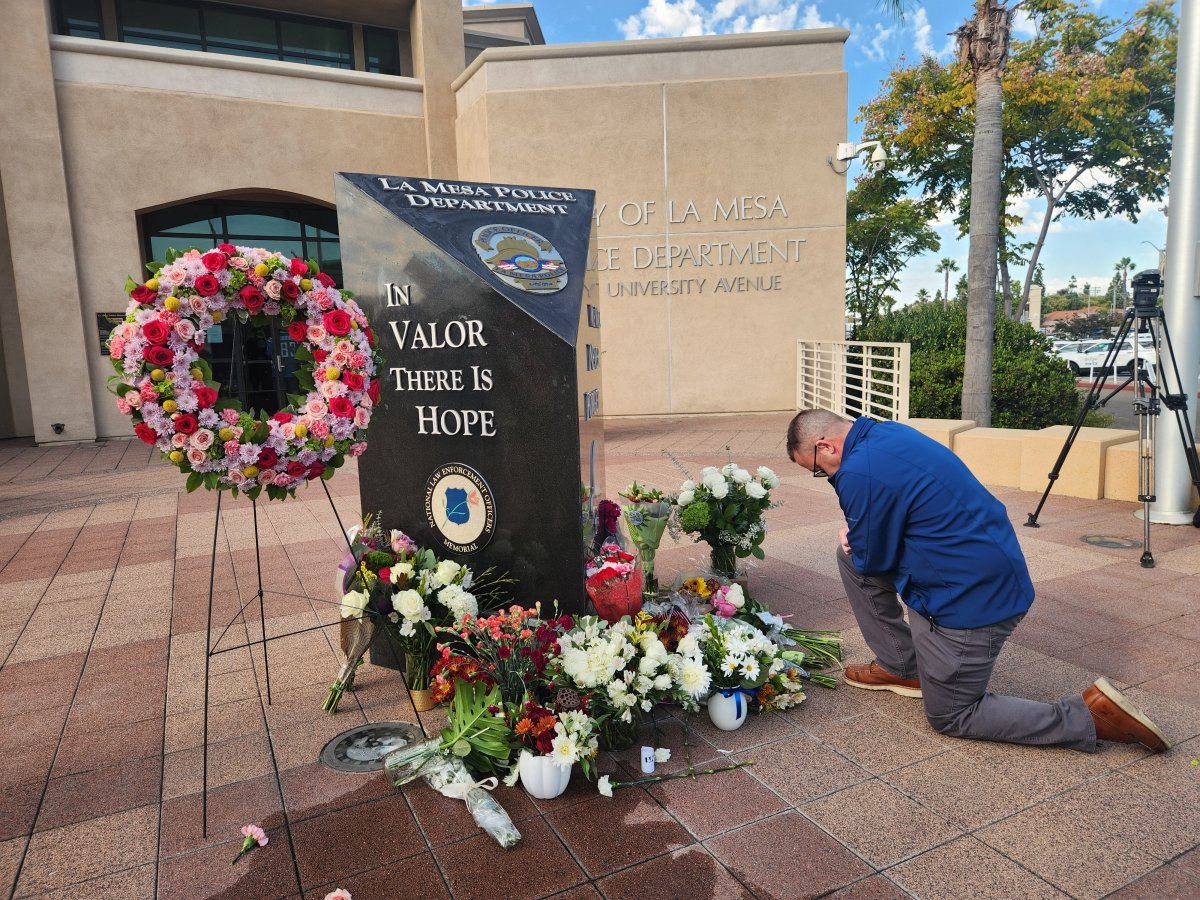 A man kneels to pray at La Mesa Police Department headquarters after leaving flowers for LMPD Officer Lauren Craven, who was killed helping others along Interstate 8 on Monday night. (Photo, left, by Karen Pearlman)