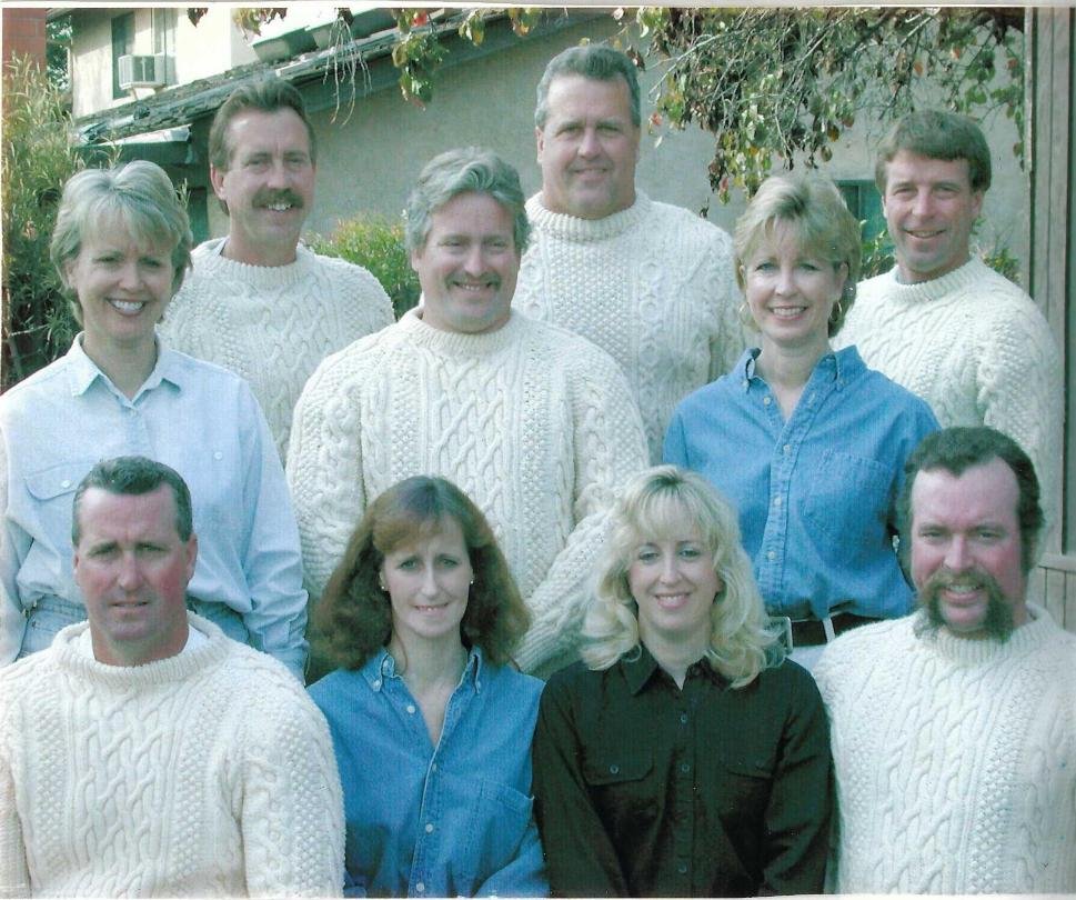 Photo, right: Eveline’s 10 children. 1st row: John Wilson, Maryann Jenson, Margie McLellan, Bill Wilson. 2nd row: Cheryl Tremble, Chuck Wilson, Debbie Harper. 3rd row: David Wilson, Glen Wilson, Robert Wilson. (Eveline knitted all her boys’ sweaters. She knitted the girls’ after photo taken.)