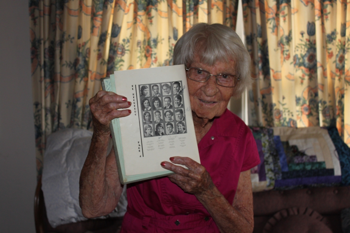 Photo shows Kouns holding her 1932 El Recuerdo to the page with her senior photo on it from the interview, which is the basis of a DVD about her that is currently being created.