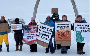 Protesters braved frigid weather even in Utqiaġvik, Alaska above the arctic circle. No Kings organizers sent a photo (above) showing smiling Alaskan demonstrators with signs making their views clear.