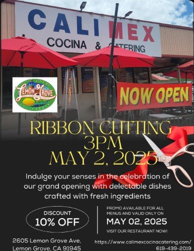 Printer-friendly versionEast County News Service April 28, 2025 (Lemon Grove) – You’re invited to celebrate the grand opening of Lemon Grove’s newest restaurant and catering company, Cali Mex Cocina and