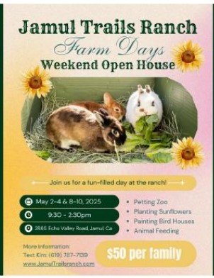 Printer-friendly versionEast County News Service April 29, 2025 (Jamul) – Jamul Trails Ranch invites you to experience Farm Days, which include a petting zoo, planting sunflowers, painting bird houses and