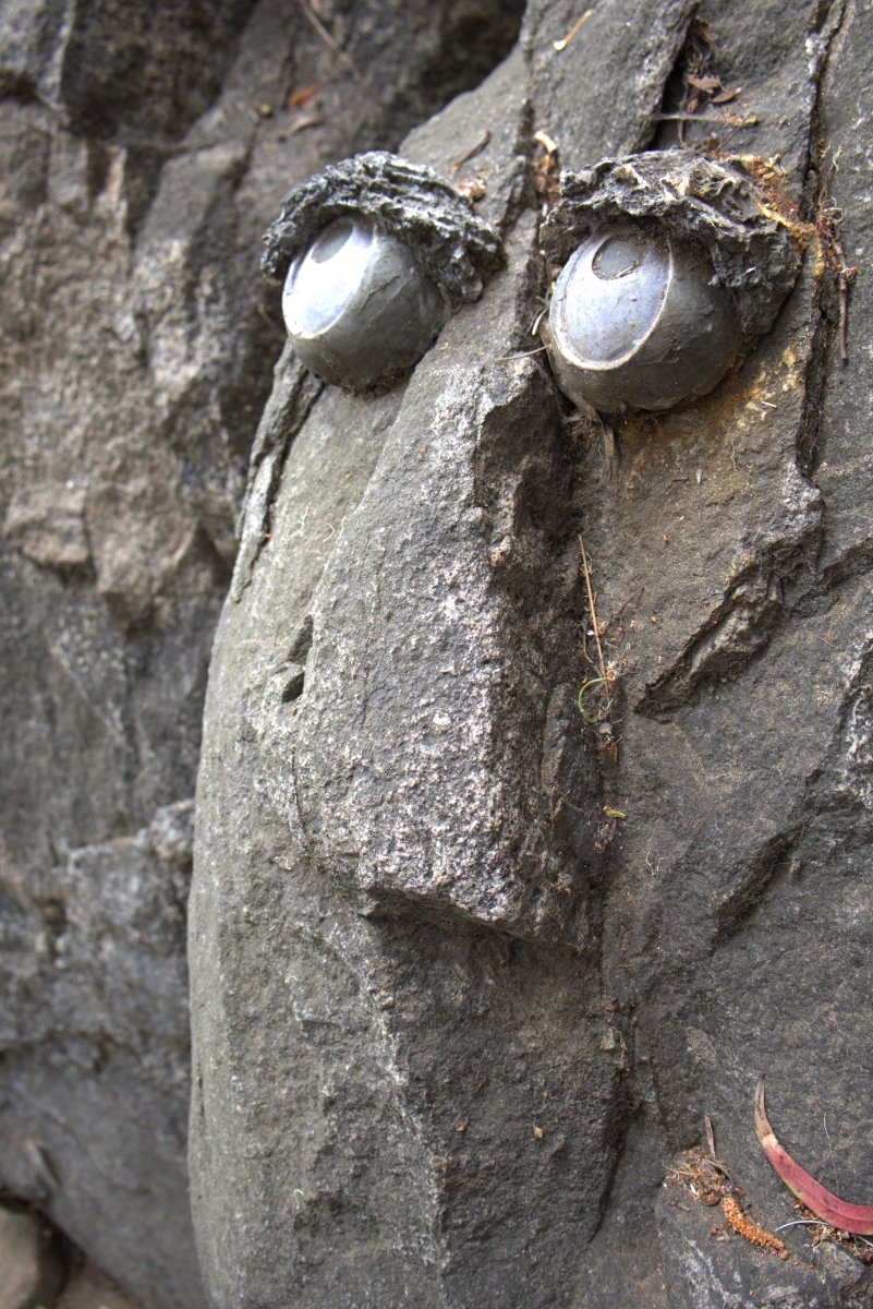Several Native American grinding rocks can be found along the path and a fairy garden awaits near the top. A few hanging glass chandeliers are hanging around the garden. There is even a set of “googly eyes” strategically placed on one weathered stone that has what looks like a nose jutting out from it.